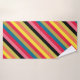 This diagonal striped bath towel set was inspired by artwork painted by Granddaughter Gigi. She loves the blue sky, the two suns and her pink version of a rainbow waterfall with black spots. Grandma Celeste created the mix and match stripes pattern.