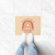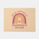 Cute doormat ideal for Grandma. A whimsical rainbow in pinks and orange. In the middle of the rainbow is a little pink love heart. Over the rainbow in pink curved text reads 'All are welcome at' and below is the word 'Grandma's House'. Both of these are tet templates that you can use to change any of the text if you wish.