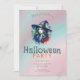At the top of the invitation, a beautiful witch takes centre stage. With her blue and purple witch's hat and striking green, blue, and red hair, she embodies both elegance and Halloween charm. The colourful design of the witch adds a mystical element, making it perfect for a party that’s not only festive but also filled with a sense of magic and wonder.
