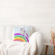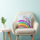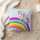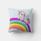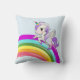 Cute, colourful, girl's throw pillow done in light pale blue, with cartoon graphics of a purple flying unicorn on a rainbow. Customise to add your own text.