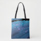 The artwork by ZoeSPEAK on this Tote Bag is an original closeup photograph of raindrops on a Manilla palm frond. The blue-tinted frond is curved, giving us views of the spacey blue water droplets from different angles. At the top of the curve we see a horizon of raindrops against the dark background. As the frond curves around, the droplets have bright highlights, and become smaller towards the underside in shadow.