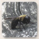 A bumble bee rests on a piece of weathered wood to dry after being caught in sun shower. This photo shows the tiny droplets on the wet bee.