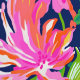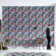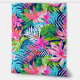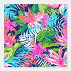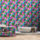 This wallpaper is a vibrant tapestry of tropical flora, featuring an intricate pattern of lush leaves and exotic flowers in shades of pink, blue, and green. The design is symmetrical and repeats throughout, creating a continuous natural motif that evokes the dense foliage of a rainforest. The bright pink flowers stand out against the cooler tones of the leaves, making it visually stimulating.