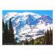 A view of Mount Rainier through a break in a grouping of pine trees.
