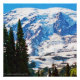 A view of Mount Rainier through a break in a grouping of pine trees.