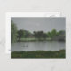 This postcard features an original artwork of a grey and rainy lakeside scene created in Vue d'Esprit by artist Jayne Wilson. A family of ducks makes its way across the lake as the raindrops fall. A stone bridge leads to a cottage on the far side of the lake.