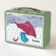 A rainy day complete with all the elements. Gary cloudy sky, rain drops, red umbrella and blue rain boots. Lunchboxes are available in seven colours, including stainless. Text can be customised.