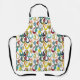 This apron has a mid-century modern design of raindrops with holes in retro colours repeated across the design on a field of white.