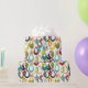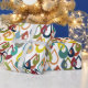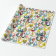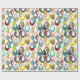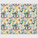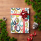 This wrapping paper has a mid-century modern design of raindrops with holes in retro colours repeated across the design on a field of white.