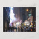 Capture the captivating energy of New York City under a soft, misty rain on a dark evening. The card’s front shows a bustling NYC street scene at night, with iconic yellow taxis reflecting in shimmering puddles on wet asphalt. Skyscrapers loom above, their lights blurred into a vibrant glow by the drizzle. Umbrella-clad pedestrians weave through crosswalks, adding a hint of romance to the moody, atmospheric setting.
