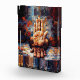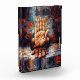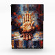 Powerful impasto oil painting of a raised open hand with palm forward in a bold gesture, supported by another hand below, against a dramatic abstract background in fiery oranges, reds, blues, and grays. Thick textured brushstrokes convey strength, emotion, and intensity. Perfect modern abstract wall art for living rooms, offices, or spaces seeking motivational energy and expressive depth. High-quality print captures the vivid colors and tactile feel.