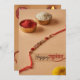 A beautifully simple Rakhi greeting card capturing the essence of tradition. The design features a delicate Rakhi resting beside a small dish of vibrant red tika and soothing yellow Chandan and rice, symbolising the sacred bond of protection and blessings. The soft, minimal background lets the traditional elements shine, making it perfect for a heartfelt Raksha Bandhan message filled with love, warmth, and timeless rituals.