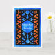 A Ramadhan Greeting card with a traditional Islamic Lattice pattern in black on a blue and orange background. The text in the central pane; is in white and reads, 'Ramadhan Kareem'. Design handpainted in watercolors by Judy Adamson. The inside is left blank for your own message.