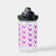A thundering herd of rampaging pink dinosaurs race across this water bottle.
