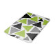 This bath mat features a modern abstract geometric design of lime green, medium grey, and black triangles randomly arranged on a white background.