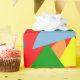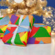 This wrapping paper has a red background with random multi-coloured triangles covering it.