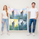 Settle in for some fairy tale fun snuggled up in this whimsical art series painting fleece blanket featuring Rapunzel in her tower from morning to night in four panels. The first image shows Rapunzel's tower at sunrise with an empty balcony, the second is morning with Rapunzel dressed in red on the balcony, the third a sunny afternoon with her letting her down and a horse on the horizon, and the fourth at night with her rescuer climbing her hair up the side of the tower in the moonlight. On the bottom is the title, Rapunzel by Traci Van Wagoner in a fun type in teal.
