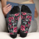Raspberry, burgundy flowers on dark grey socks