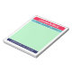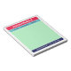 Colorblock notepad for back to school with a note from mum of [your children's names] at the top and your name and phone number at the bottom in a combination of a retro script and a timeless sans serif font with colorblocks of raspberry red, turquoise, mint green, and navy blue for a colourful and eye-catching yet tasteful look. Circle the name of the child your note regards to by hand. Jot down your message on the mint green background.