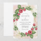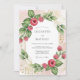 This design features a lush arrangement of vibrant red raspberries nestled among deep green leaves and delicate gold botanical line art. A soft pink watercolor wash creates a romantic backdrop for the fresh, fruity theme. Perfect for a warm summer event, the artwork combines natural elements with a touch of elegant shimmer.