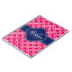 Raspberry pink white Moroccan lattice pattern with a navy monogram initial. On top of the bright pink and white trellis pattern is a navy blue and white label featuring a monogram letter and name template for you to customise.