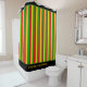 Rasta flag coloured red, yellow and green striped bathroom shower curtain. Across the bottom is the quote 'Welcome to mi bathrum' which is customisable so you can add your own wording, or delete if you prefer