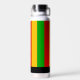 Bright Rasta flag coloured green, yellow and red striped water bottle. It features a monogram square on the front where you can add your own initial