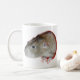 Button, an agouti rat with dumbo ears, peering out of a hole in your mug.
