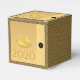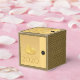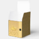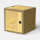 Elegant design with golden paper-cut of a rat with fruits (+ the same paper-cut in grey forming drop shadow. Design on classic cube favour box card with Large 2020, Year of the Rat and monogram onto black round + + Black and decorative pattern background, You can easily change text (font, colour, size and position) by clicking the customise button. Available in other styles: tent, gable, take-out. Matching postcard; greeting card, invitation, sticker and more. Perfect for a personalised Chinese New Year 2020.