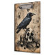 A raven is perched on a skull resting on a stack of books, surrounded by candles. Arcane symbols and illegible text on old, grungey parchment completes the illustration from a book of spells. Gothic, haunting, and perfect for those who walk on the darker side.