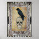 A dark gothic halloween image featuring a skull, a beautiful raven, placed in a vintage frame on a back ground of black and white stripes dressed with a grunge texture. © WickedlyLovely