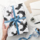 An original ink painting of black ravens in flight, painted in loose and strongly flowing brushstrokes, surrounded by splatters of black ink, a pattern depicting freedom and creative self-expression.