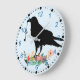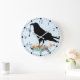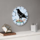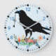 A raven dangling a key from beak and standing on flowers. Clock numbers in blue and minutes in black.
