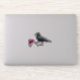 A black crow holds a pink orchid on this distinctive sticker.
