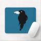 Image of a black crow with a large white beak. Seems to be smiling about something. Blue background.