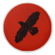 A simple, black silhouette of a Raven (Corvus corax) on a red, leather-look background image. The raven image has been given a slight "rough" or "worn" effect.