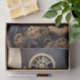 Tissue paper features digital artwork of a raven, steampunk style. The intelligent black bird is wearing a top hat decorated with gears and cogs against a background of the same (steampunk aesthetic).