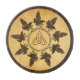 Nine lively ravens (Corvus corax) circle around a knotted Norse/Celtic ring. A triquetra, a triangular figure of three interlaced arcs, appears at centre. Everything is superimposed on an old paper background image, giving it a mediaeval feel. You may change the colour of the border ring or remove it altogether.