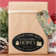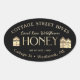 This editable oval "Local Raw Wildflower" label is great for backyard beekeepers. "Honey" is written with an 'embossed' font in a light-coloured metallic gold gradient with three hives on a black background. Add your apiary name, varietal, honey net weight, and location.