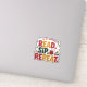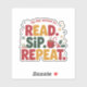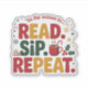 Celebrate holiday reading with this playful design featuring "READ. SIP. REPEAT." in festive red, green, and gold lettering. Each word is accented with cute icons: an open book, a steaming cocoa mug, and holly with berries. Curved text above reads "'Tis the Season to..." while snowflakes and sparkles frame the design. Perfect for cozy bibliophiles, coffee lovers, and festive readers.