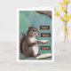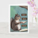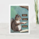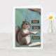 Cute watercolor sketch of a squirrel reading books with teal background. Missing you my friend friendship card.