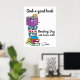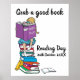 Simple mono grab and good book kids reading day poster. Personalized with your own reading day event date. Original girl sitting on a stack of books reading fairy tales drawing and design by www.mylittleeden.com