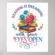 Vibrant, colourful design featuring a dragon with stack of books, the top one open with blue and pink roses. The colourful text reads: "Reading is dreaming with your eyes open". This design is available on a wide variety of products.