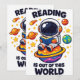 Reading is out of this world shows a cute astronaut sitting on a bright planet while reading a book in space. A playful space themed reading scene for book lovers, students and science fans who enjoy imagination and curiosity.