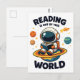 Reading is out of this world shows a cute astronaut sitting on a bright planet while reading a book in space. A playful space themed reading scene for book lovers, students and science fans who enjoy imagination and curiosity.