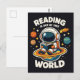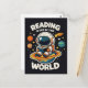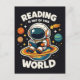 Reading is out of this world shows a cute astronaut sitting on a bright planet while reading a book in space. A playful space themed reading scene for book lovers, students and science fans who enjoy imagination and curiosity.