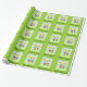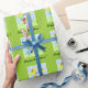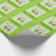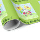 A kid green birthday wrapping paper with the tile illustration of a ladybug reading a book under two yellow flowers and the words "Happy Birthday" written beneath it . Perfect for a spring birthday :) © ArianeC Illustrations