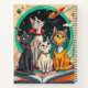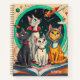 Journal in an illustration of four cats sitting on an open book, gazing at a rocket soaring through a cosmic backdrop. Each cat sports retro-futuristic space gear, blending vintage sci-fi charm with whimsey. The scene evokes wonder, adventure, and imagination fuelled by books.