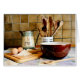 A still life photo arrangement of cooking or baking utensils: flour and eggs on a wooden cutting board, a vintage tin jug with an advertisement for milk, wooden spoons and a shiny earthenware bowl. The perfect design for hobby cooks and bakers - of course professionals would like this, too!