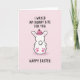 This card shows a simple cartoon bunny 🐰 from behind, centred on a soft pastel pink background that feels like a private, sweet moment. The bunny is bright white with rounded shapes, a fluffy ball tail, and small paw pads tinted a rosy pink, adding a coy touch. A snug fuchsia knit beanie sits on its head with a ribbed texture and a fluffy pom‑pom, echoing the pink accents and giving it a flirty, friendly look. The pose reads like the bunny is teasingly showing off for someone close, like a partner or best friend who’s in on the joke 🐇. At the top, a cheeky phrase appears in thick black uppercase letters, arched slightly above the character. Near the bottom, a short seasonal greeting is set in matching black text, spaced to frame the bunny without covering it. Strong black outlines define the bunny and the lettering, standing out sharply against the pale pink field with no extra scenery. The only other details are the pink toe pads, the beanie’s pom‑pom, and the centred white tail against the flat pink backdrop.